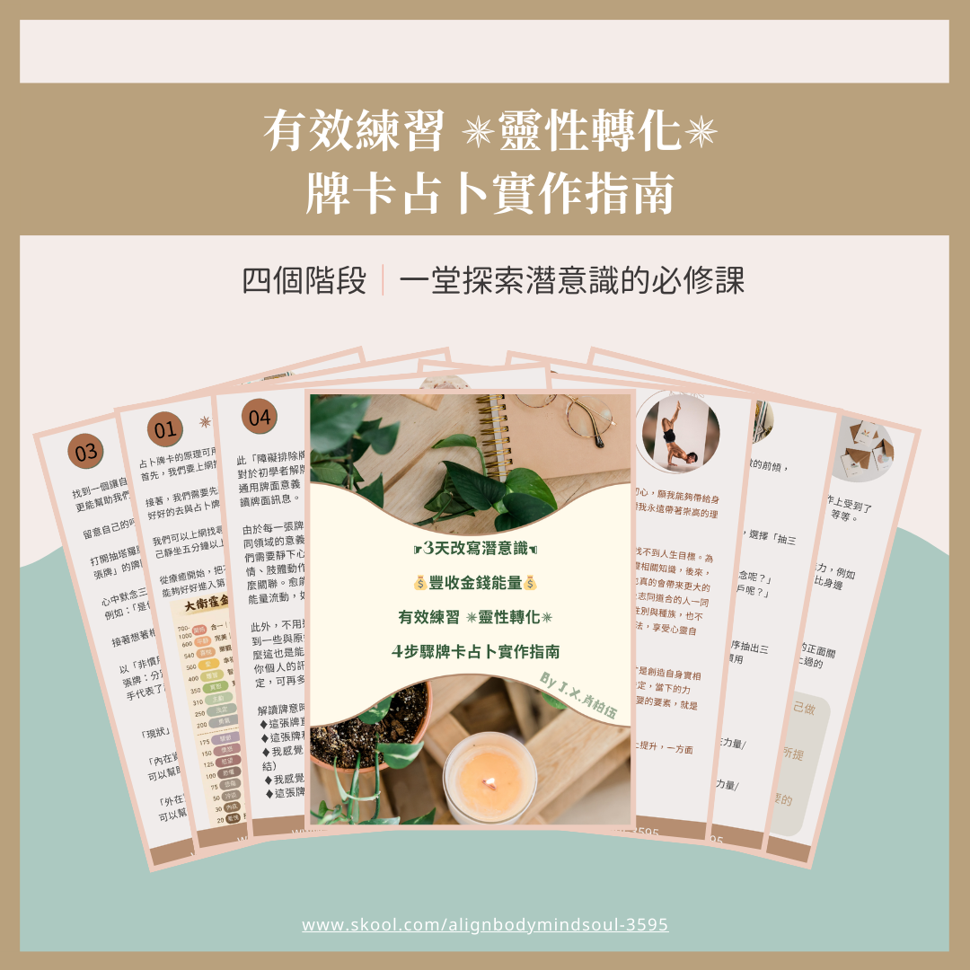 限時免費索取 ☛3天改寫潛意識☚ 💰豐收金錢能量💰 有效練習 ✵靈性轉化✵ 4步驟牌卡占卜實作指南 轉化潛意識的限制性信念回到當下的自我占卜靈性探索 如果你 → 找不到一個可以挖掘限制性信念的有效方法→ 想要轉化潛意識、改變周遭能量與運勢,卻不知道如何有效的開始 現在我把多年的教學經驗和自我練習整理好淺顯易懂又方便練習的步驟分享在這個「免費下載」中!原來靈性探索這樣做最有效,跟著我提供的方法一起來試試看吧! 限時免費索取 實作指南 免費下載